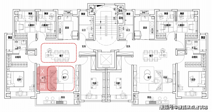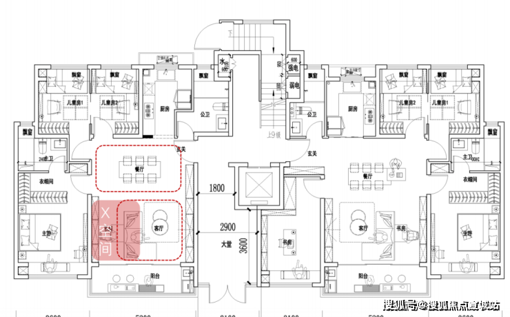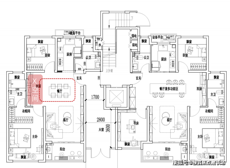 一梯两户,四叶草户型,三开间朝南,全卧飘窗,约5.2米小横厅!