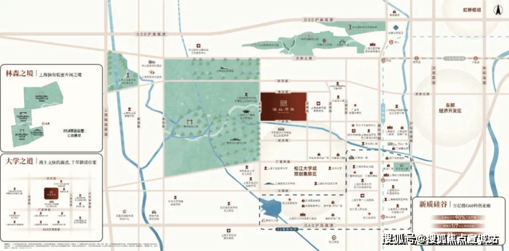 而项目的南面松江大学城7所高校如星辰汇聚,十余万师生在此激荡思想——这里是人才的熔炉,创新的策源地。更与G60科创走廊共振,人工智能、生物医药、量子科技等前沿产业在此蓬勃生长,科技之光正重塑时代的天际线。