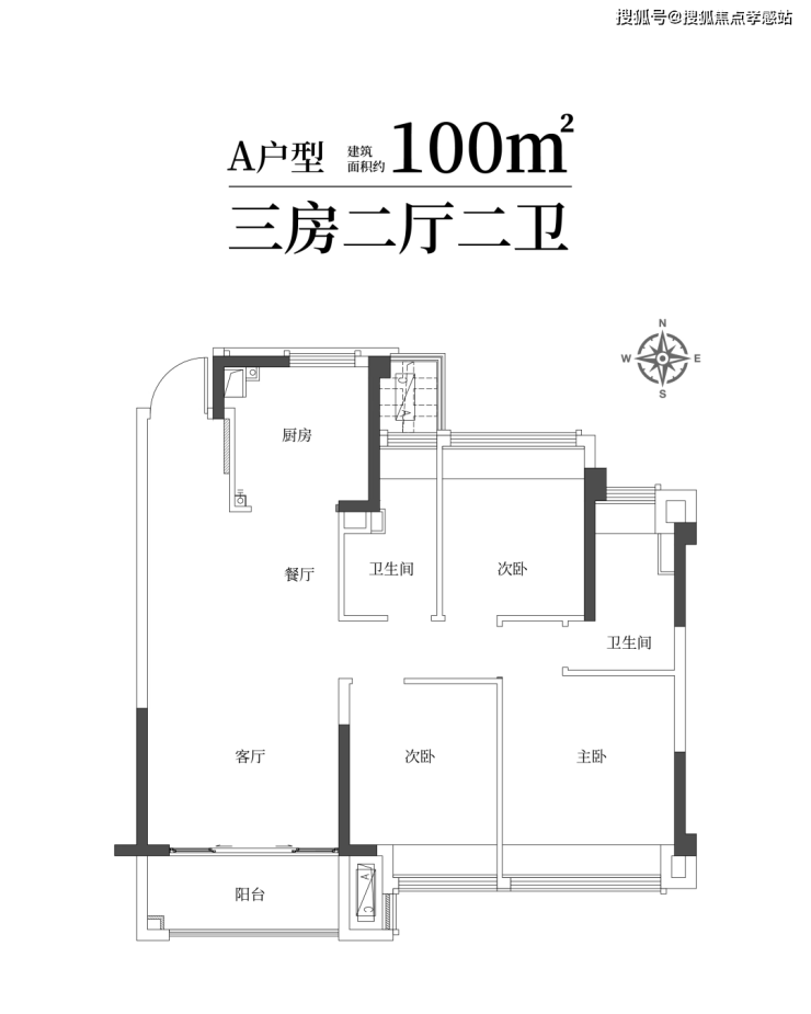 建筑面积约100㎡雅致三房两卫,满足二娃时代