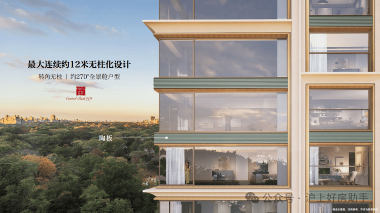 项目部分户型的主卧不仅有约270度无柱飘窗,甚至还有户型做到了上海首个最大连续约12米无柱化设计的全景舱户型!