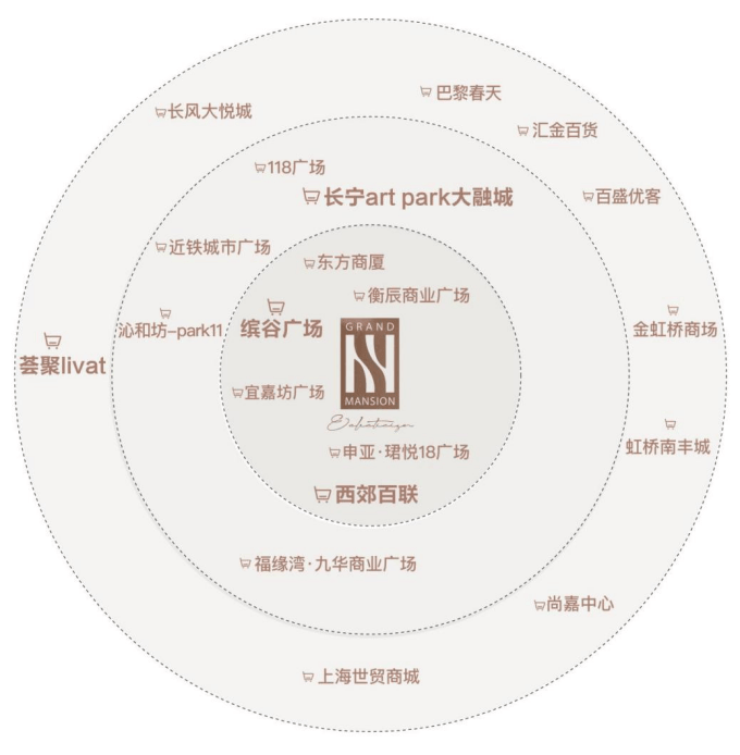顶奢配套全新长宁国际生活圈:临近缤谷广场、百联西郊购物中心,东方商厦等老牌商业,3KM范围内涵盖金虹桥商场、上海荟聚、虹桥南丰城、尚嘉中心(LVMH集团投资)等超106万方商业综合体(*数据来源于百度地图测量及百度统计)