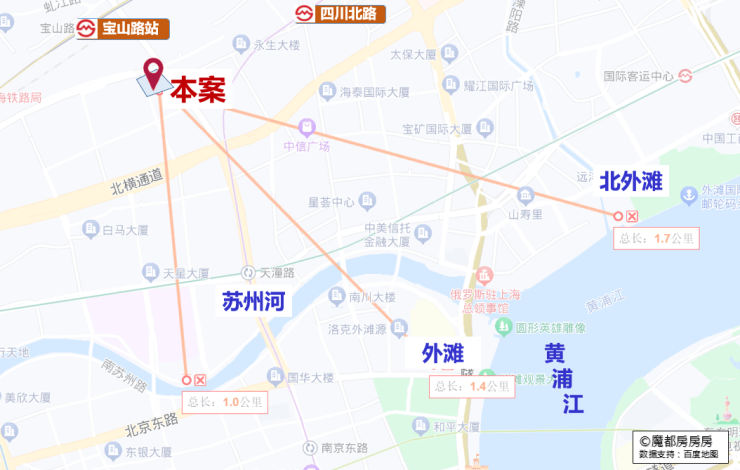 仅从图上看,该地块直线距苏州河约1公里,直线距外滩约1.4公里,直线距北外滩约1.7公里,直线距3/4号线宝山路站约300米,直线距10号线四川北路站约560米,区位优势明显。