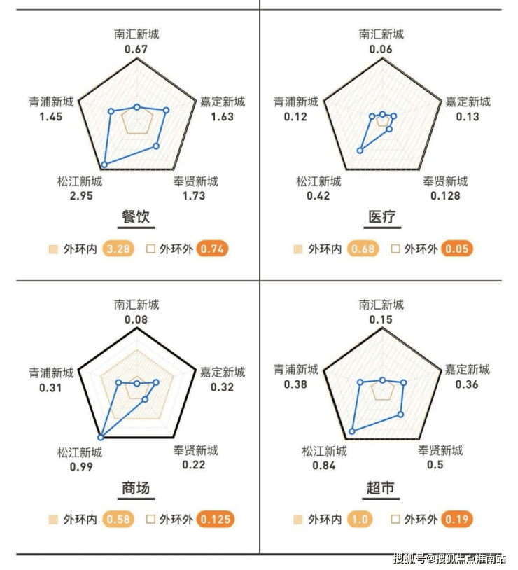 松江新城是上海最早开发的新城,也是最早通地铁的新城,商业医疗等城市配套密集程度在新城中首屈一指,下面这个对比一目了然。