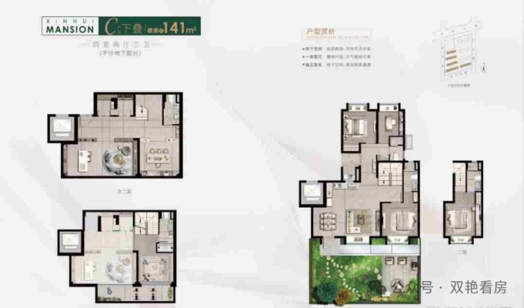 5.别墅:毛坯双层空间,下叠双层地下室,上叠,双向露台,中叠南向露台