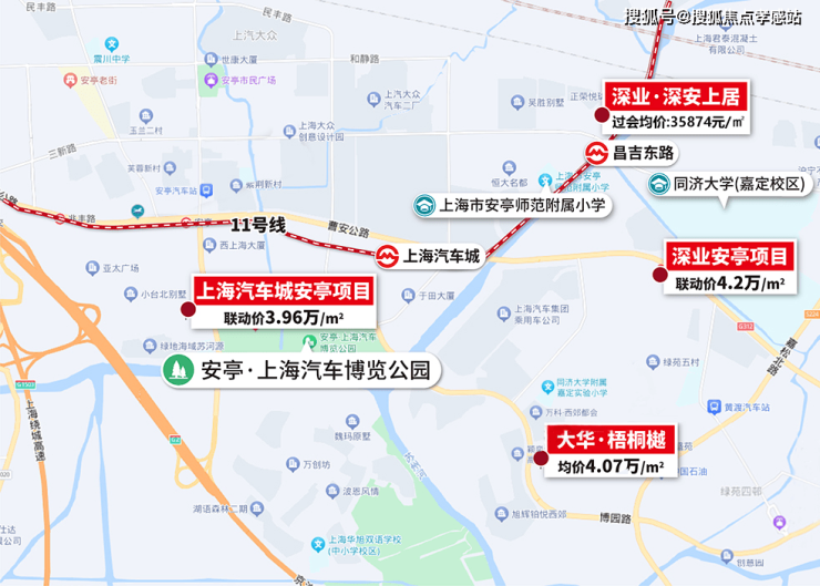 地铁11号线昌吉东路站直线仅约200米,2站可达嘉定新城,9站虹桥火车站,且同区域仅约1公里的深业安亭项目联动价已达4.2万/㎡。