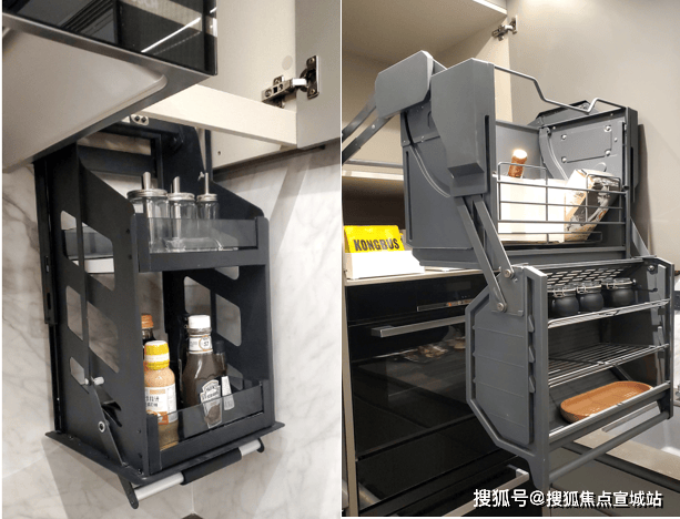 两处下拉柜设计更是人性化,将抽屉、拉柜都做足分割隔断,方便收纳厨房的各类物品。