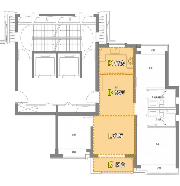 户型内部设计整体非常方正,KDLB一体化设计,形成超尺度公共社交场域,南北通透。