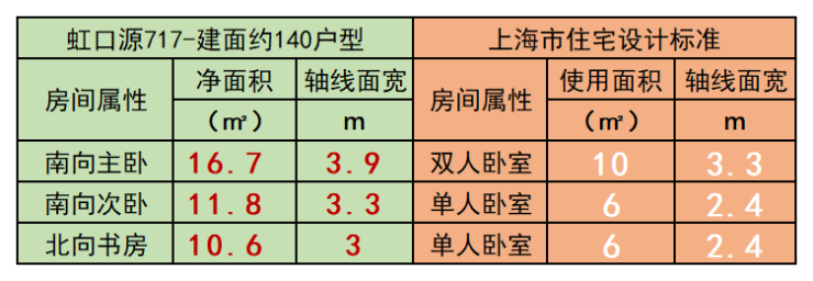 对比最新的《上海市住宅设计标准》,每一个居室的面积都远超标准,北卧室更是超过标准规定值的约76.5%。