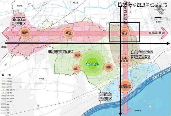 根据金山区2035总规,金山区东西向的亭枫发展轴、南北向的亭卫发展轴两条发展轴在亭林交汇。