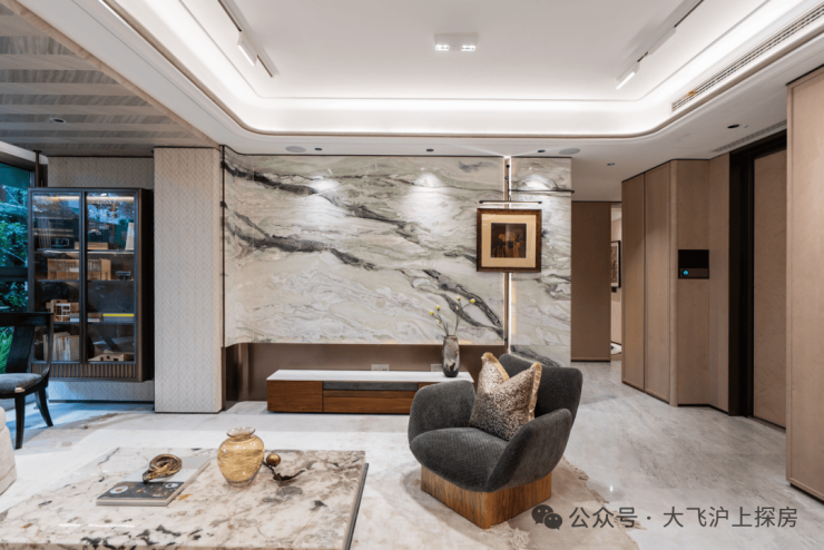 入户做了精致玄关柜,柜门为温润木饰面包裹,壁龛选用奢石映衬,质感非常棒。