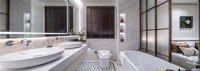 卫浴:科勒/TOTO(马桶、花洒、浴室柜),马桶旁配置手持水枪+手机支架,细节拉满;卫生间做干湿分离,搭配防雾镜、防滑地砖,安全又实用;