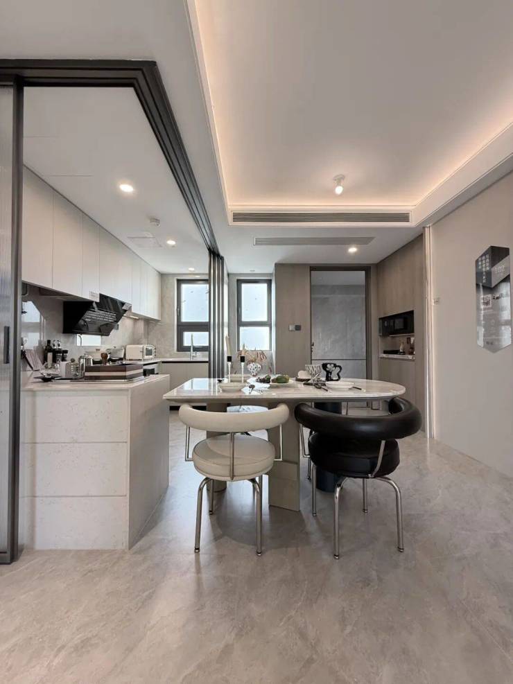 LDKB一体化设计。通过金属玻璃移门和岛台联动,达成餐厨一体,增加家庭成员互动。烟道外置以及S墙内嵌设计,优化空间布局,提升台面使用感和转角柜使用频率。