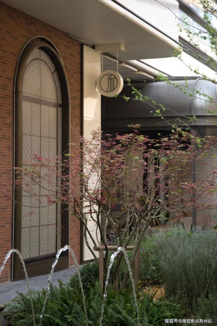 归家树阵构成归家序曲,入口景墙的浅色石材与木质元素共舞,质感丰富,与会所红砖主体形成反差。设计注重细节,如对称水景、茂盛绿植环绕,营造出自然和谐且宁静的氛围。