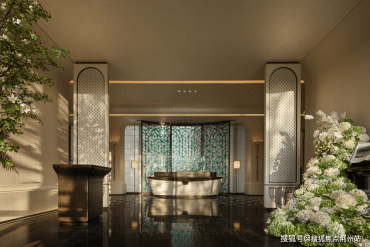 滨河步道空间创造礼序感,提升绿意隐奢的高定社区感受。建筑周围环绕着精心设计的绿化,树木高大,植物修剪整齐,营造出宁静舒适的氛围。地面铺设海水江涯纹肌理的石砖,水景的加入更增添了一份灵动。整体设计注重细节,追求自然与建筑的和谐统一。
