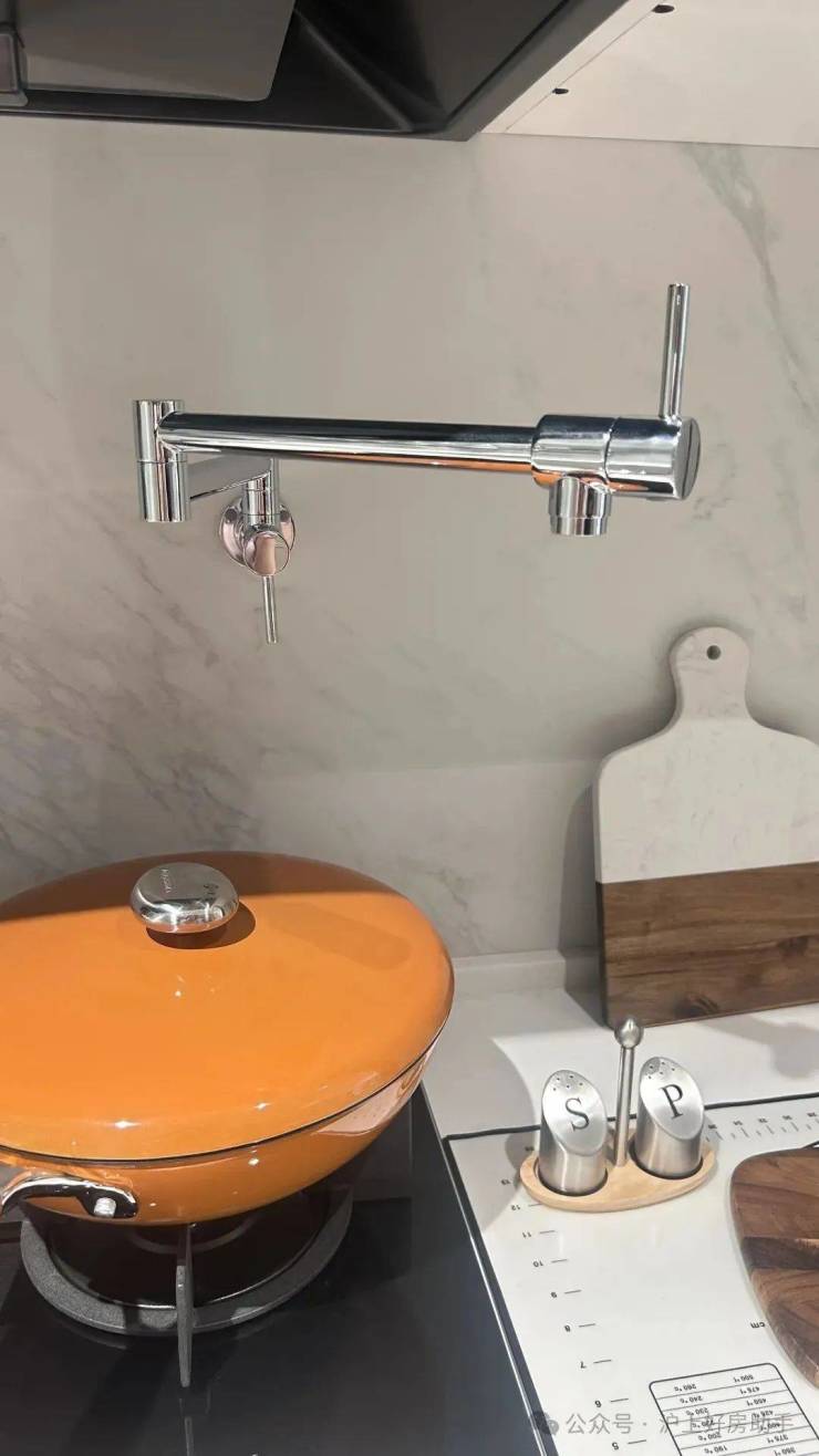 厨房超大柜体的收纳空间,包括调味拉篮、岛台双面收纳,将厨房空间直接扩容约80%,贴心的灶前龙头设计,开火时直接上方接水,非常灵活;