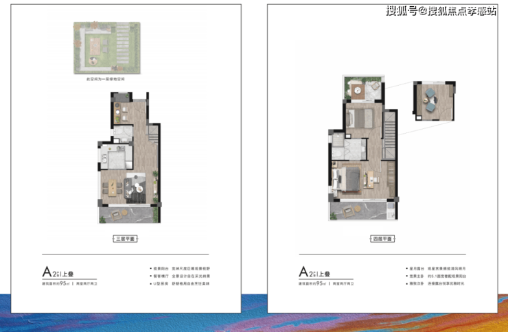 来看户型,面积段有两种——建面约95㎡下叠、上叠;建面约150㎡下叠、上叠。