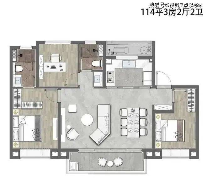建面约114㎡3房2厅2卫户型▼