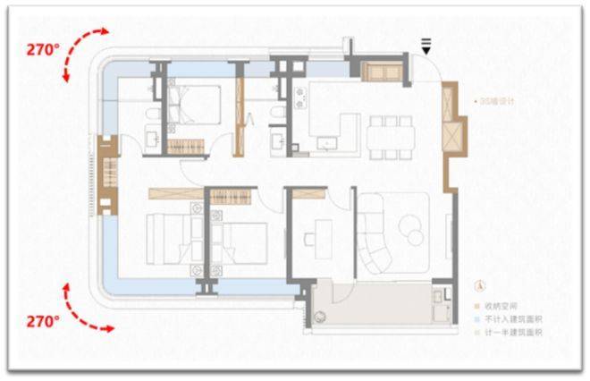 第三处山墙s墙的技术含量更高,直接让户型拥有两个大转角飘窗(主卧+主卫均双270°弧形转角飘窗)。凹处填放一个衣柜,视觉效果舒适,业主第一眼无知无觉,殊不知背后大有玄妙。