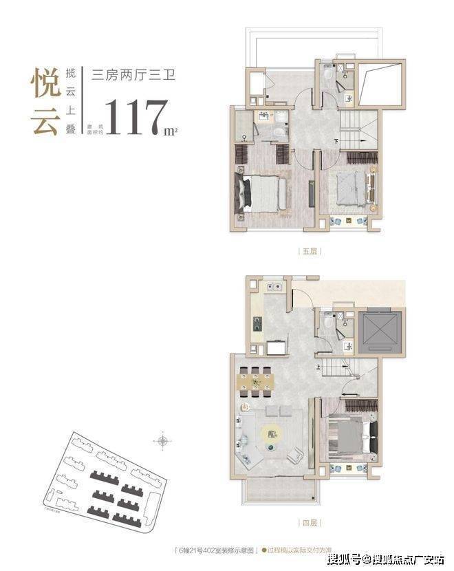 此外,同悦湾璟庭还有总价更友好的建面约117㎡三室上叠,得房率约86%,楼上楼下双层设计,既有私密空间又有互动区域。