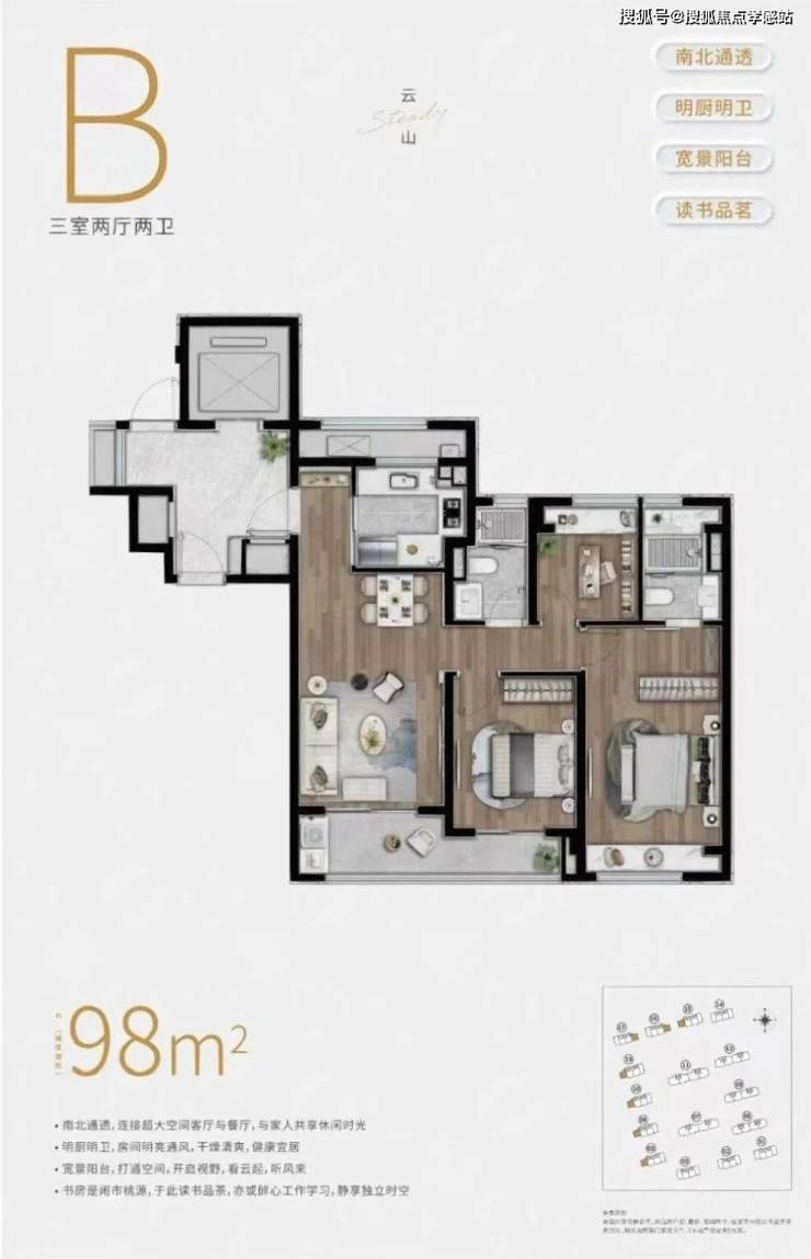 实用性方面,户型3房3卫、南向双套房的设计,可以保证每个家庭成员都能拥有更具私密性的居住空间。