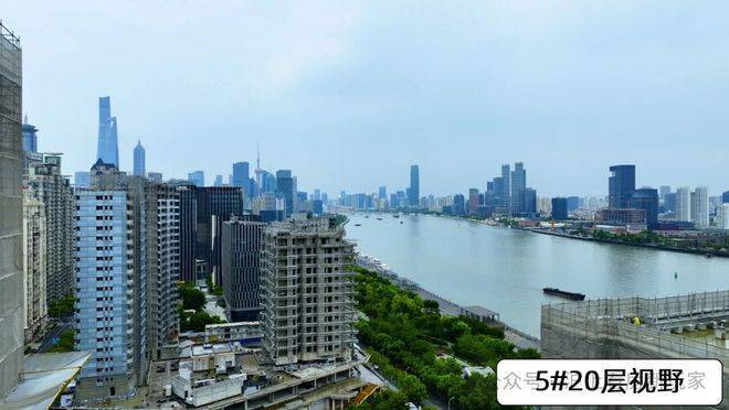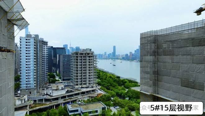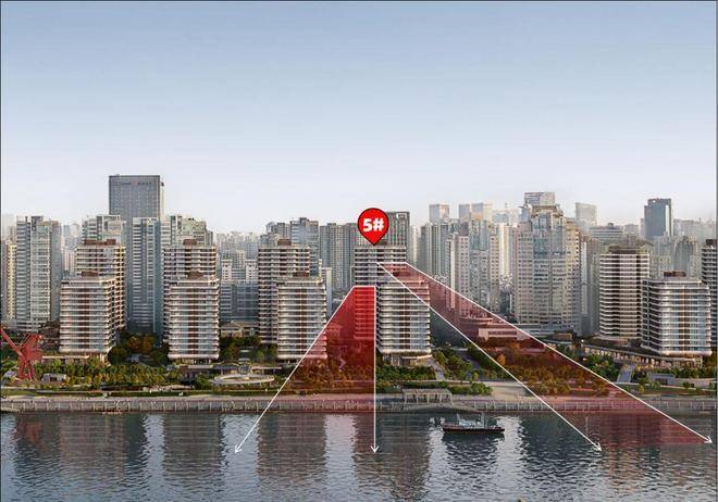 5#楼按照现场视野模拟,由于南侧1#楼的遮挡,若要纵览比较全的江景,需要20层及以上。