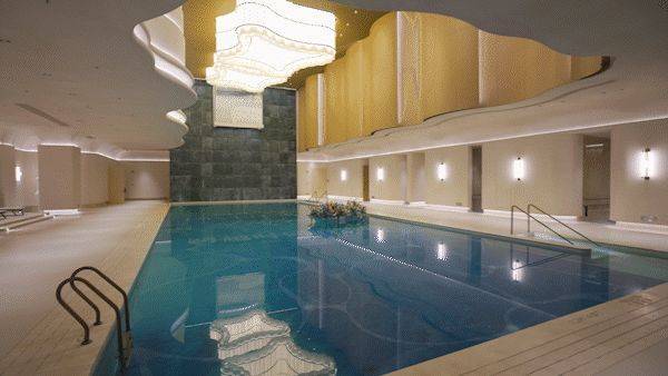 两层挑高的泳池,目及之内满屏的“弧形”元素,还能从天顶上引入自然光,让你完全不觉得自己是在地下会所的空间内;