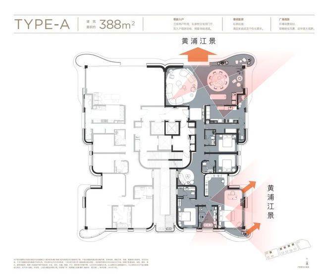 建面约388㎡户型,位于滨江首排、江景0遮挡。