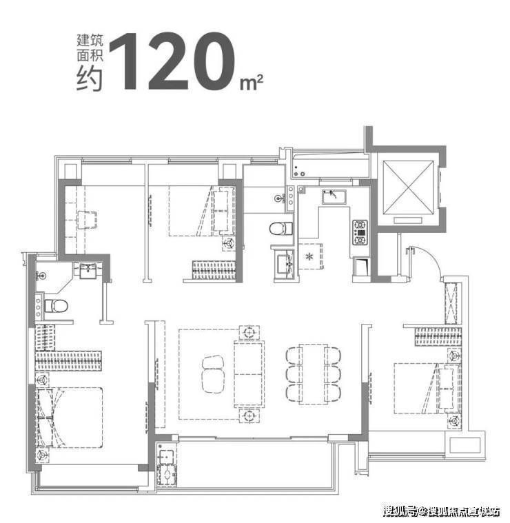 项目充分利用小高层+一梯两户的高得房率优势,不仅以建面约120㎡的面积,做出了媲美市面上建面约130㎡尺度的4房户型,而且还设计了南向超大横厅,如此兼顾实用性与尺度感的户型实属罕见,非常适合改善置业的客户。