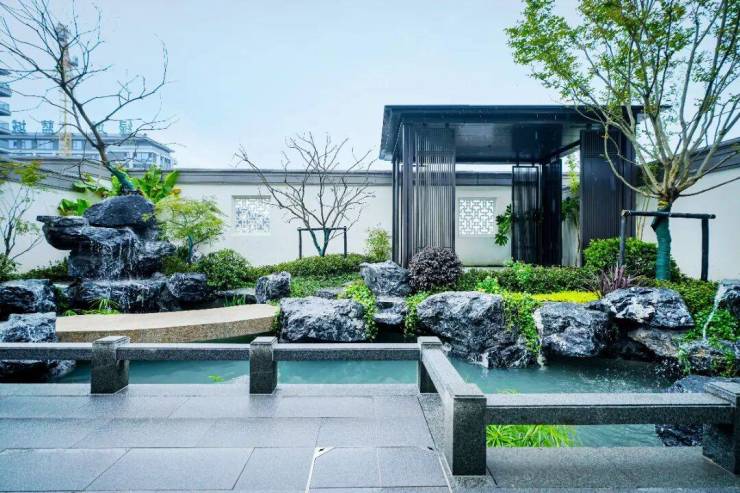 推开院门,东方美学花园映入眼帘,小桥流水、叠石景亭,意趣盎然,令人仿佛置身一幅流动的江南水墨画中。“小院朱扉开,天地纳君怀”,让现代人与东方花园久别重逢,找到独立的闲趣空间,回归精神文化的原乡。