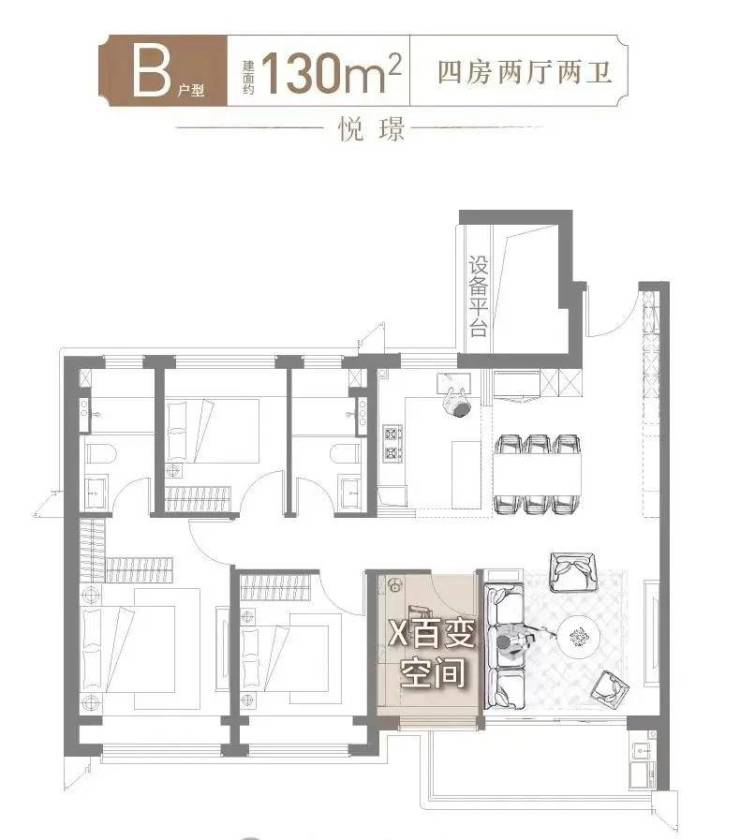 130㎡大户型,我们能看到创新设计的X百变空间,链接家人情感的同时,更强调提供丰盛多变的生活方式。在这里,居住者可以将其打造为书房/琴房室,为自己带来放松身心的私享空间。同时,也可以将其拓展,成为约6.2米面宽的超级会客厅,尽可能延伸出更大的社交场地。