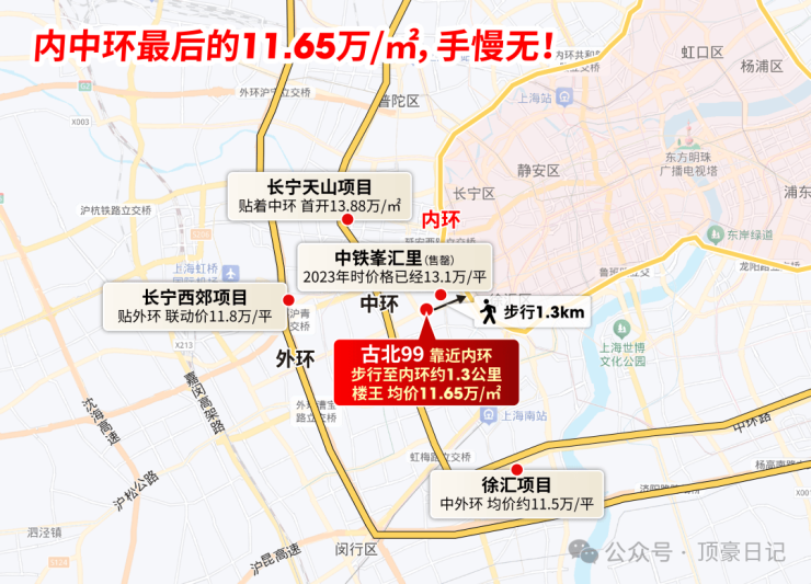 再看环线位置:🔵古北99售楼处电话☎:400-8787-740【售楼处已认证】⚡⚡步行到内环仅约1.3公里,均价11.65万/㎡;而长宁天山项目贴着中环,首开13.88万/㎡;长宁西郊项目临近外环,联动价也要11.8万/㎡。