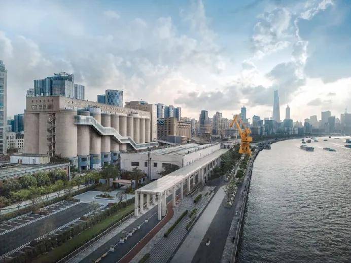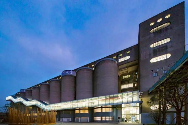 红砖建筑改造为总部办公+艺术空间;8万吨筒仓顶层打造一线江景观景餐厅,中区引入美术馆/演艺空间,低区保留储粮漏斗改造成艺术展览;