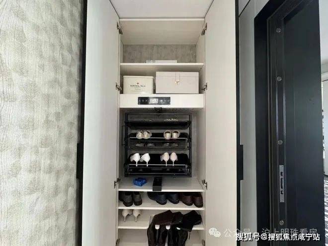 入户门是是非常有质感的铸铝门,带电子猫眼智能门锁;进门后是一个独立玄关,木纹玄关背景墙,右侧是通顶的悬浮玄关柜,内置鞋柜精灵和抽拉鞋架。