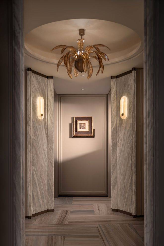 经典十字序列厅: 从私享电梯厅开始,经由对开入户门,首先就进入这样一个十字序列厅,视线远处,就是尽头观景台,这条长廊,可以是公私分区的交通枢纽,也可以是彰显主人品味的艺术长廊;