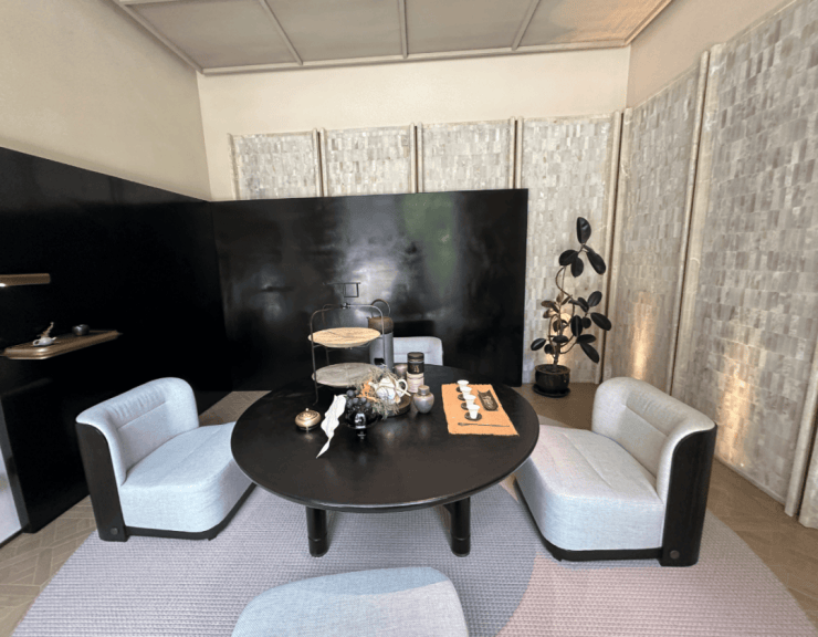 整体一层空间的东南方向,样板间设计为了茶室,配合西向落地玻璃窗,同样正对庭院。