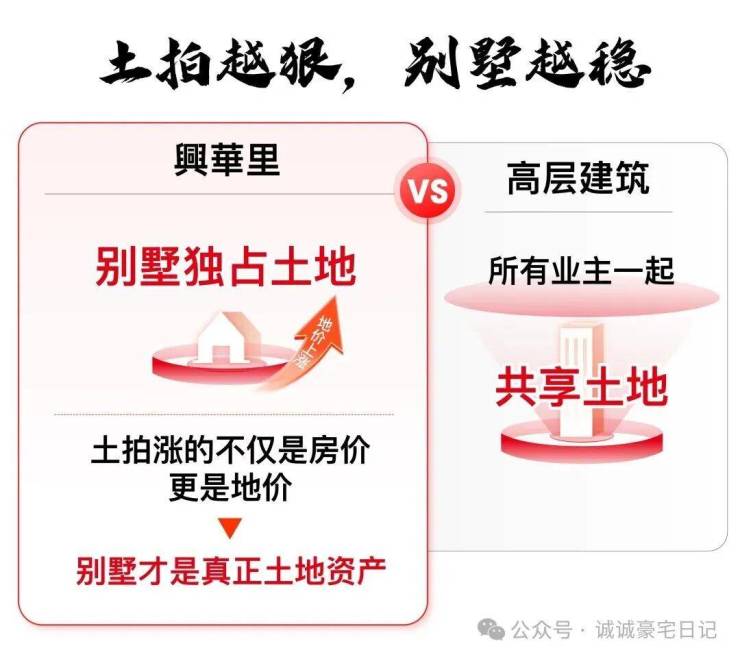 高层「竖向共享土地」,土地增值需高层住户均分;而别墅「横向独占土地」,土地增值独占。