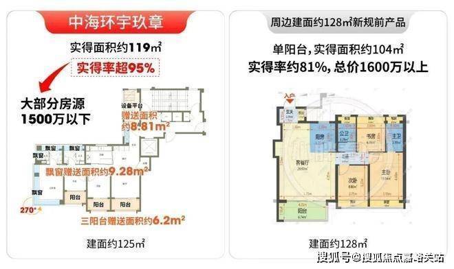 环宇玖章125户型实得率超95%,而宝华项目实得率仅约80%。按同等实用面积折算,环宇玖章实际单价就更划算,仅约10万/㎡