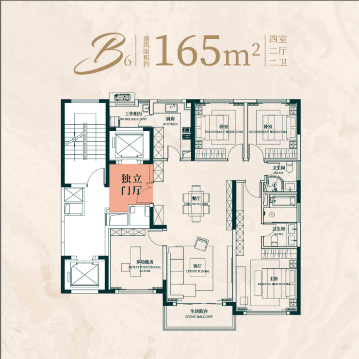 建面约 183-197㎡四房两厅三卫:四开间朝南,超大面宽,采光通风拉满。双套房设计,主卧配 270° 观景飘窗,次卧带独立卫浴,老人孩子居住更方便;客厅衔接阔景阳台,俯瞰苏河全景;多功能间可做书房、儿童房,灵动多变,适配全生命周期需求。