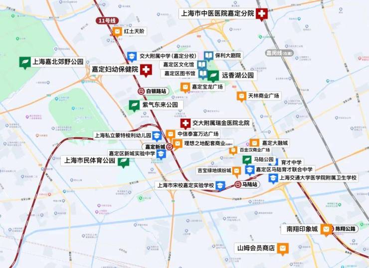 配套方面,项目周边交通便捷,距11号线嘉定新城站约1.7公里,社区配备接驳巴士;在建的嘉闵线(2026年通车)将进一步缩短至虹桥枢纽的通勤时间。商业配套丰富,步行可达宝龙广场、TSF购物中心,驱车至南翔印象城MEGA仅需15分钟。教育方面,周边涵盖中福会新城幼儿园、上海实验学校嘉定新城分校等优质资源。医疗配套完善,3公里内覆盖瑞金医院北院(三甲)、上海市中医医院嘉定院区(三甲)。