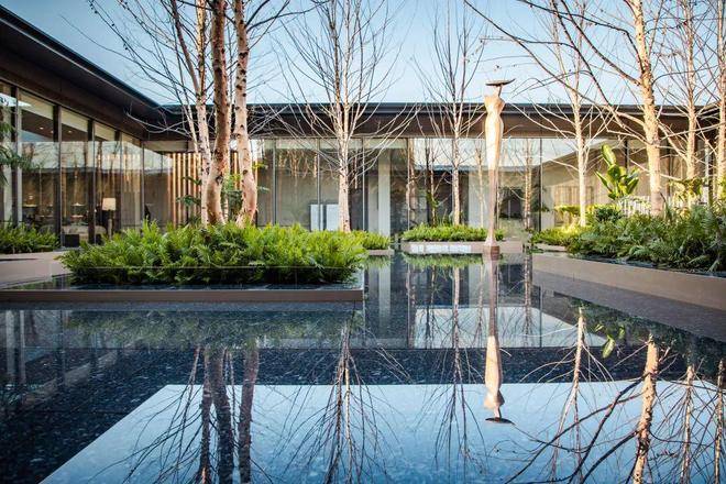 第二进珠翠回廊内,墙体选择的是美国白麻石作为基色,作为世界高端花岗岩石种之一,充分彰显改善人居的奢华品味。并以水面森林为主体,种植大量美国鲑鱼粉河桦树阵,金钱草、迷迭香、笔筒树等林下植被,让归家的尊贵与仪式感应然而生。