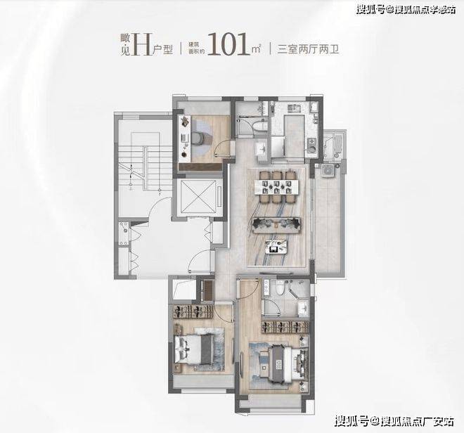 建面约101㎡的F和G户型都是市面上备受认可的飞机经典款户型。