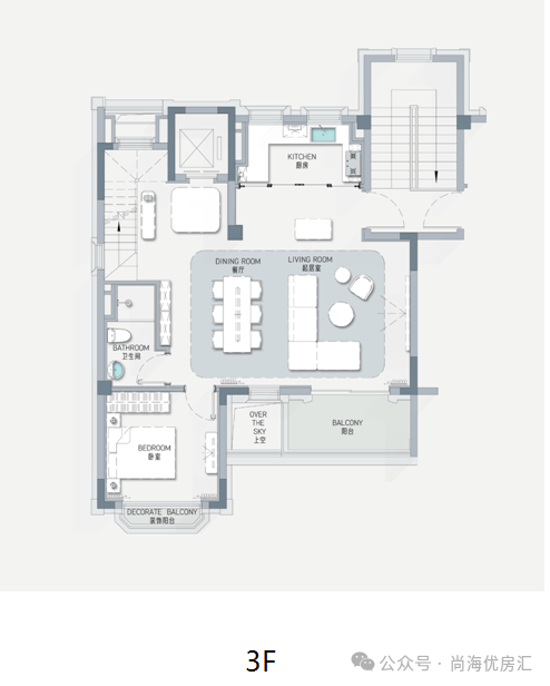 项目通过一楼家庭庭院,二楼星空露台,三楼罗密欧阳台,复原经典的三段式设计规制,还原出武康路罗密欧阳台的经典邬达克式摩登场景。