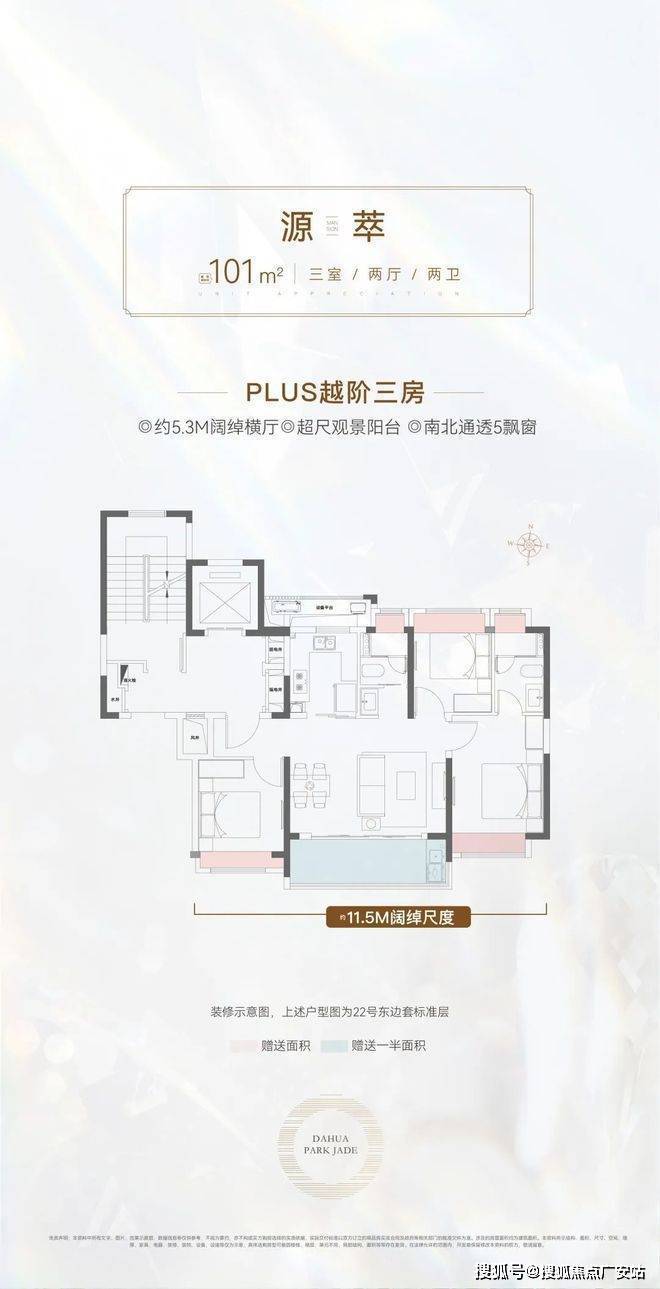 布局:飞机户型,三开间朝南,面宽约11.5米,5.3米大横厅连接阳台,U型厨房+主卧套房设计,全屋5个飘窗。