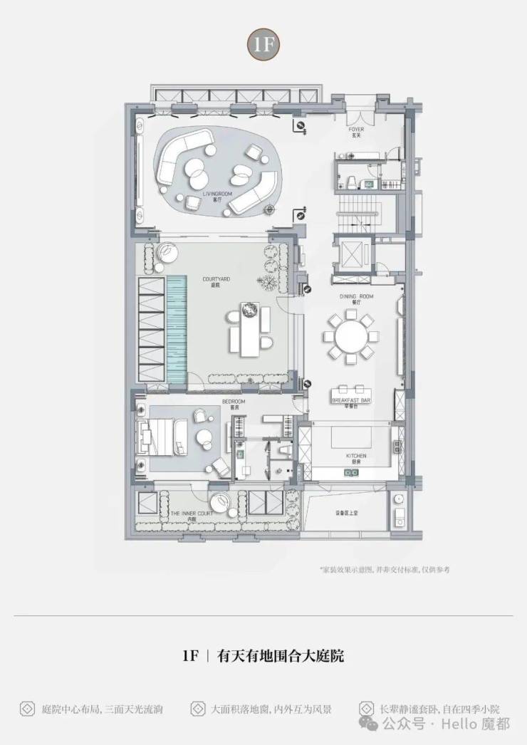 庭院中心布局,客厅、餐厅、卧室三面均可采光,内外相映成趣