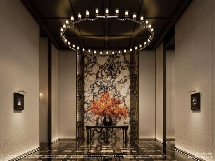 材料 选用 意大利石材, 大理石,铝型材塑型红, 四层金属网格 墙面以及 梧桐叶金属屏风 等, 打造独属老静安的记忆符号,高奢定制,市区豪宅调性拿捏!