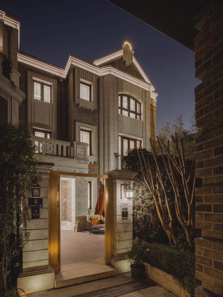 地上三层、地下两层的别墅。从建筑风格看,承扬老城厢的海派建筑风貌,重塑里、坊、庭院的形式,拉近了人与人的距离,唤起了老上海人刻在基因里的念旧,又用现代的设计手法,极简的设计理念,把外立面做的干净利落,迎合当下审美。