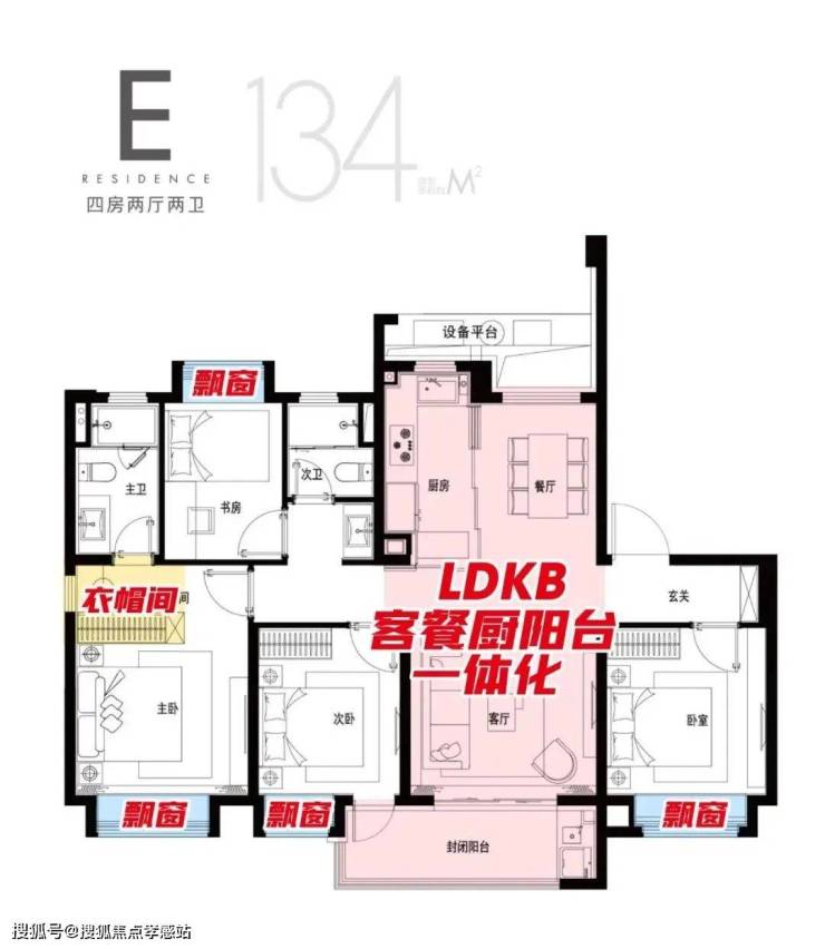 四开间朝南、南北通透大尺度格局、公共LDKB客餐厨阳台一体化设计、主卧就寝区、衣帽间、卫浴间层层递进;每卧飘窗也是标配。