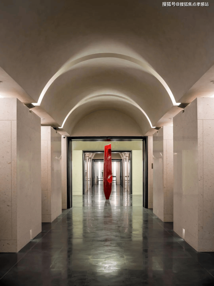 在二楼的接待大厅中,一尊红色的雕塑矗立而起,其顶端延伸至三层楼高。大厅内会定期更换展品,充满了浓厚的艺术氛围。