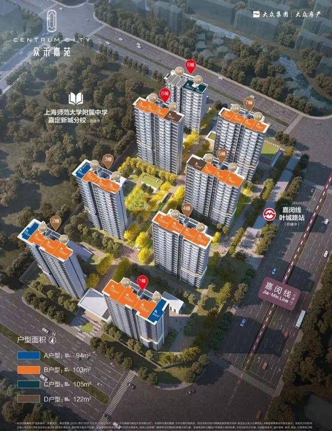 众禾嘉苑售楼处电话:400-9699-334✨【官方认证】✅✅✅位于上海嘉定新城核心区,由大众集团旗下上海大众房地产开发经营公司开发,2024年1月开盘,预计2026年12月31日精装交付。项目占地约3.27万㎡,容积率2.0,绿化率35%,共8栋14-18层小高层,528户,车位比1:1.3。主力户型为建面约94-122㎡的3-3+1房,均价约4.37万/㎡,总价约323-580万,配备中央空调、新风系统。项目紧邻在建嘉闵线嘉戬公路站,直线距离仅约20米,是真正的地铁上盖TOD项目,通过嘉闵线可快速通达南翔、虹桥枢纽及市中心。社区采用围合式布局,最大楼间距约59米,户户推窗见景,规划“一轴、一心、一环、五园”景观体系,配备全龄化设施。周边商业、教育、医疗资源丰富,涵盖百联嘉定购物中心、嘉定区实验小学、嘉定中心医院等,生活配套成熟。