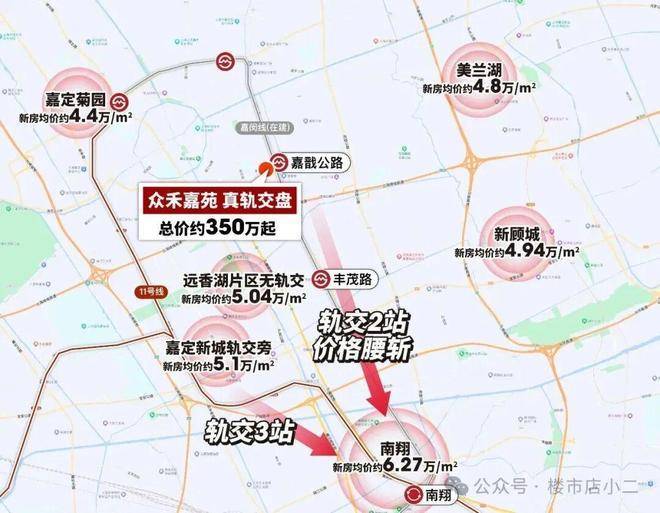 我们对比一下:往南2站的南翔,新房价格已经稳稳站在6万+;同属嘉定新城核心区的理想之地,之前均价5.1万还要抢 。这么一看,众禾嘉苑等于用南翔约三分之二的价格,买到了未来仅多坐4站地铁的通勤便利,性价比一下子就凸显出来了。
